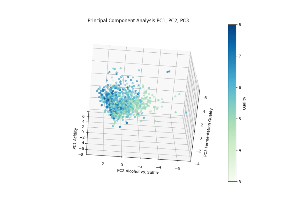 Rotating the plot around shows a slight clustering of quality around the PC3 axis with more positive values. This would indicate higher alcohol content and tracks with the clustering demonstrated by PC1. This clustering seemed much less pronounced than the clustering observed in PC1.